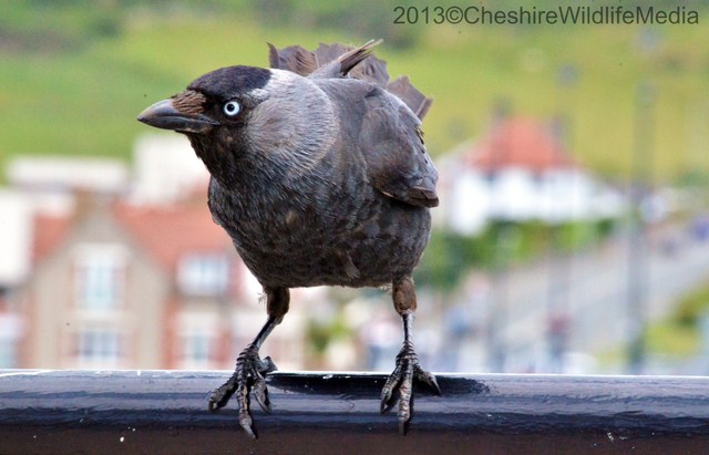 Jackdaw with the Little orme behind and houses on Old Colwyn road